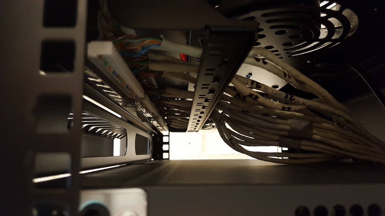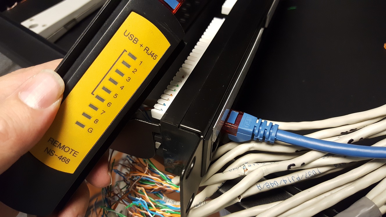 Als dat eenmaal achter de rug is begint het tijdrovend karwei van CAT5E of hogere gecertificeerde patchbekabeling af te monteren in de patchpanelen. Dit moet per kabel voor elk van de 8 aders gebeuren met een speciale tool. Helaas had de verkoper van het pand de patchpanelen laten verwijderen van de bestaande bekabeling. Dat is jammer want de kosten van een patchpaneel wegen niet op tegen de arbeidsuren om de bekabeling weer correct aan te sluiten.